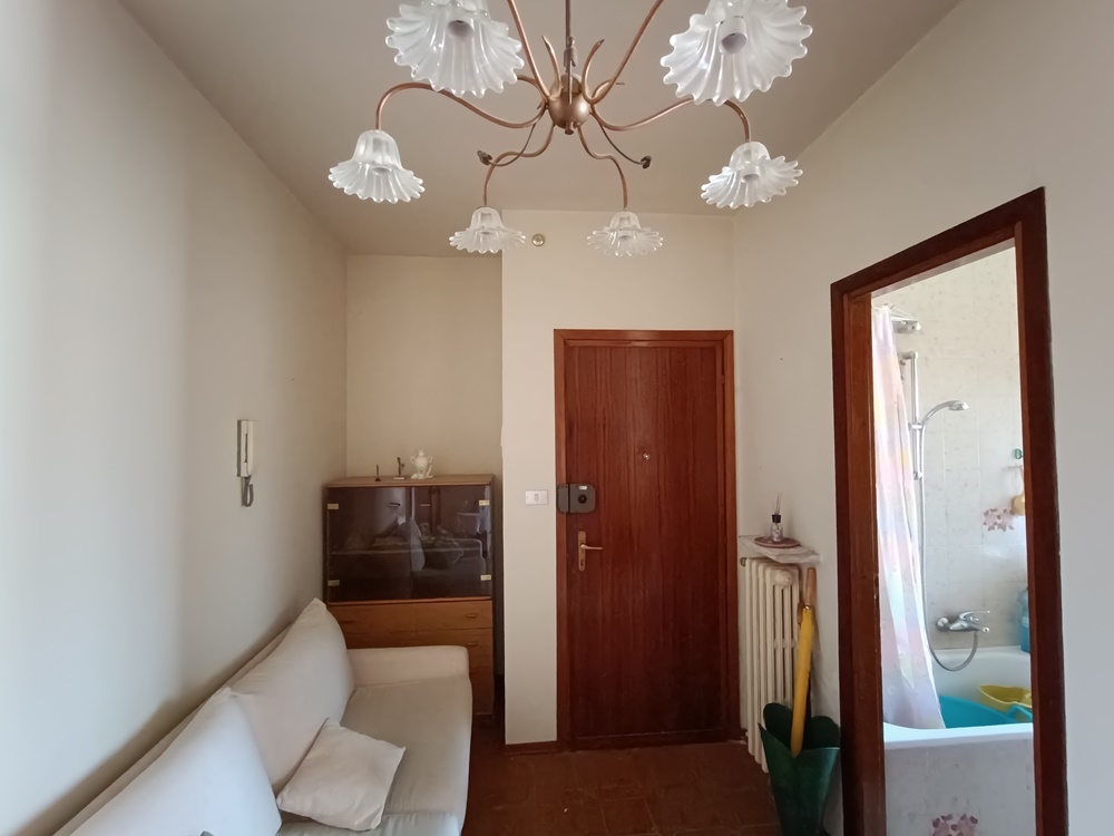 Ingresso su ampio disimpegno, cucina/soggiorno, una camera da letto e un bagno.