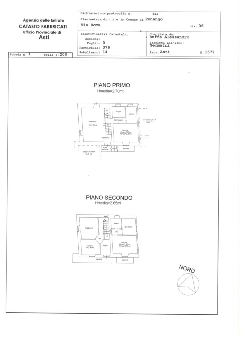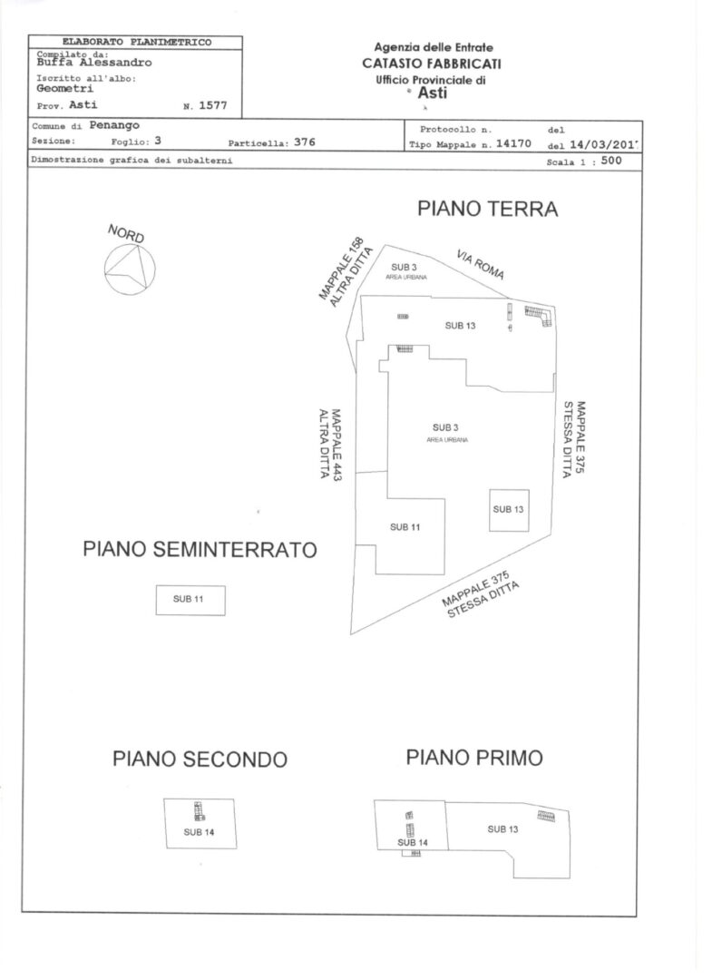 Piano Terra: locale caldaia. Piano Primo: soggiorno comune. Piano Rialzato: cucina, camera da letto e bagno. Secondo Piano: due camere da letto (di cui una con allacci per eventuale cambio a cucina), bagno e un balcone. Mansardato: medesima disposizione del piano precedente.